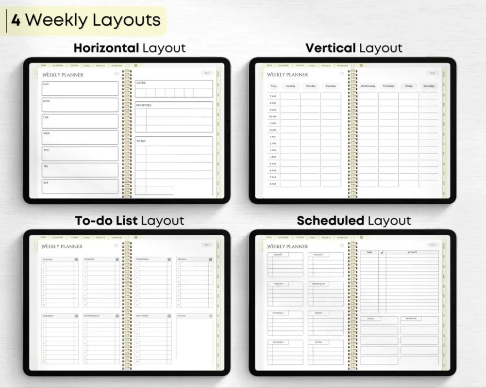 ✔ 4 Weekly Planner Layout options (Boxed, Horizontal, Vertical & Scheduled)